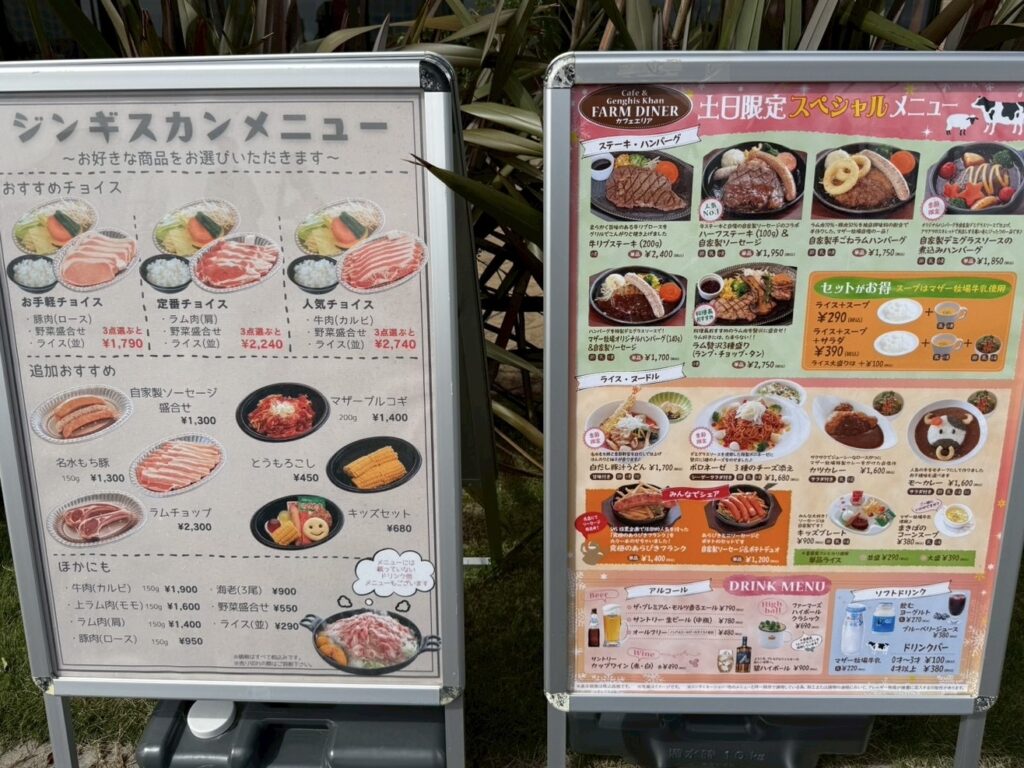 なお土日祝は屋外席でのジンギスカンメニューが利用不可ですので、ステーキやハンバーグなどのカフェレストランメニューのみとなります。