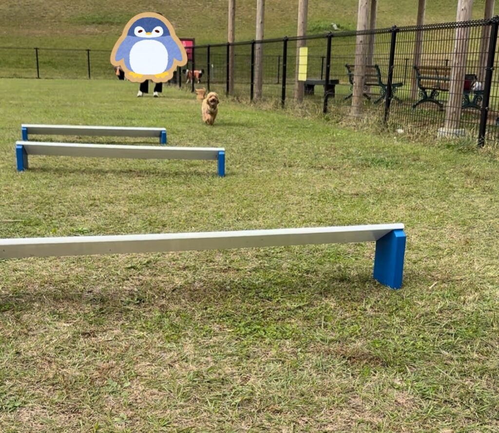ポールやジャンプ台などのちょっとした遊具があり、天然芝で広々としていました。